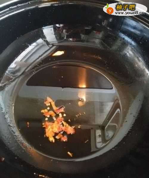 4在炒锅中放入适量的花生油,将干辣椒段放入锅中,炸出香味。