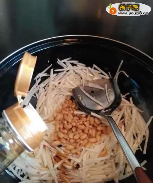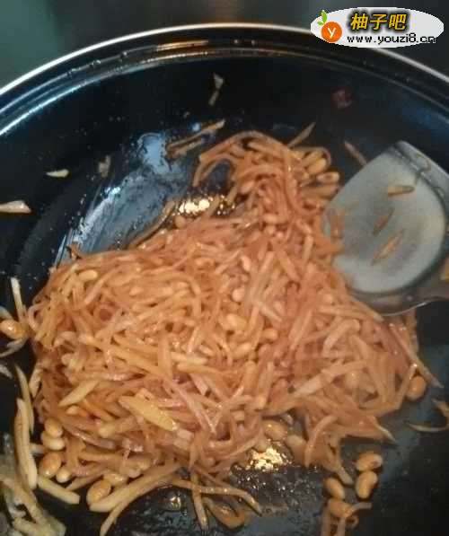 6再将煮熟的黄豆放入锅中,再翻炒几下,搅拌均匀。