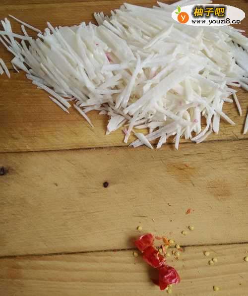 2将旱萝卜去掉外皮,再切掉根和须子,用刀切成细细的丝,再将干辣椒切成小段。