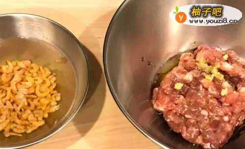 虾米泡水1小时后沥干,留1/3米杯的泡虾米水,绞肉加入腌料拌匀备用