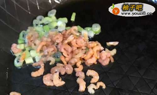 3起油锅下两小匙油爆香葱白后,下虾米炒出鲜香味