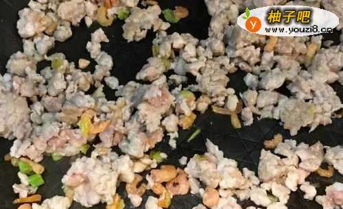 4绞肉下锅炒散,与虾米葱花拌炒一下