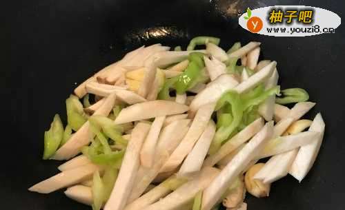 6放入杏鲍菇和青椒,中火炒至八成熟。