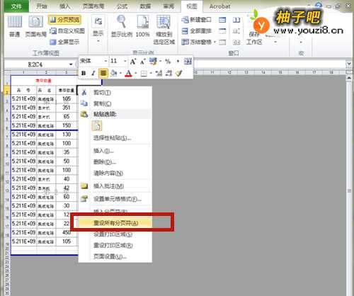 d) 右击鼠标,在弹出选项中,选择【重设所有分页符】。