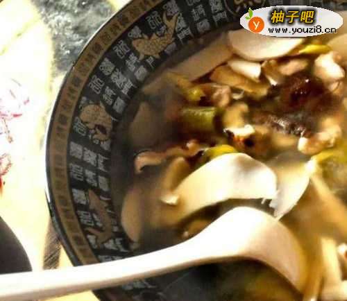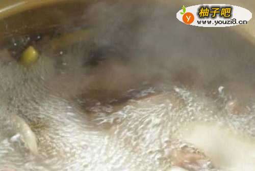 4兔骨大概熬30分钟后,放入菇片、泡椒