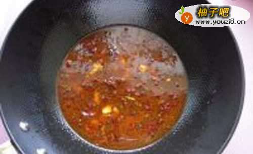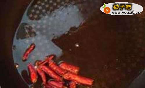 6再起锅,食物油烧热,干红辣椒剪断,控掉辣椒籽,下入滚油内。