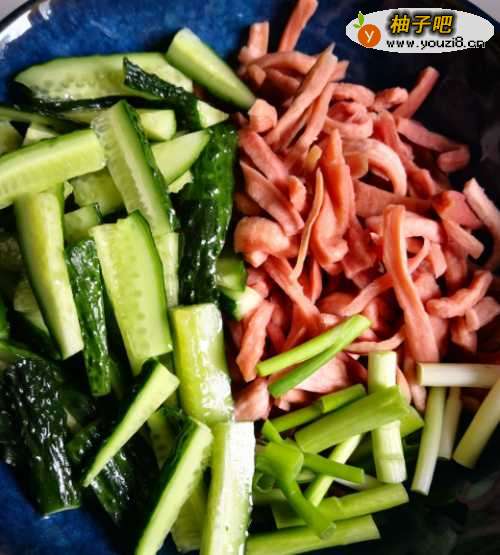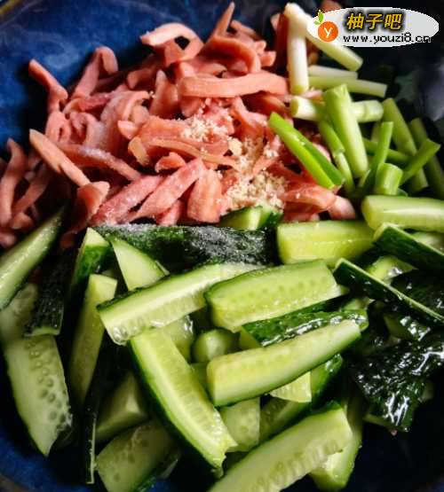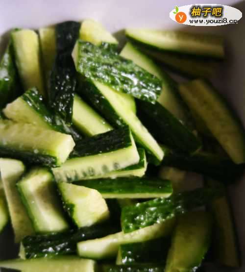 2接着,将黄瓜切条,放入少许盐腌制15分钟;