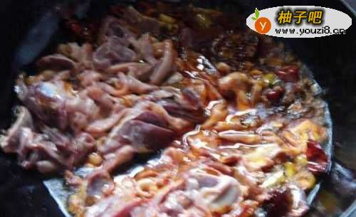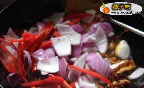 5放入切好的洋葱,辣椒丝,掺入少许鲜汤,调入白糖、鸡精、炒至汁水将干且鸡杂成熟关火