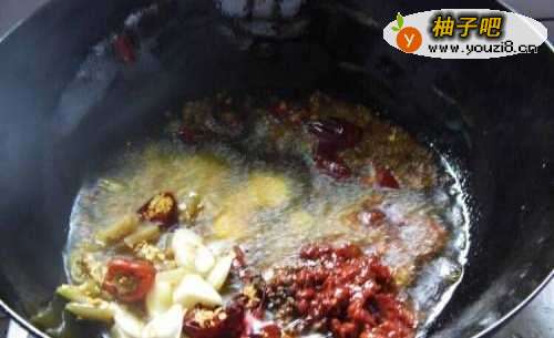 3锅内放入多一点的油,加入郫县豆瓣酱炒出红油,再下入花椒、干辣椒泡姜、泡辣椒、蒜片炒香