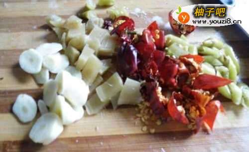 2大蒜切成片,泡椒、泡姜切成段,干辣椒剪成段待用(洋葱切成小块,红辣椒切长条,香菜切段)