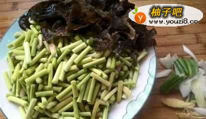 3蒜苔、木耳放在盘子里。将葱、姜切好。