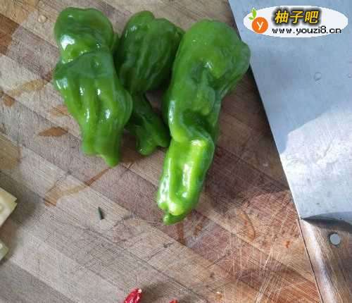 如图,首先取来两颗青椒和一颗干红椒,洗净并切好备用。
