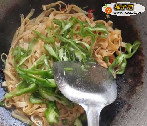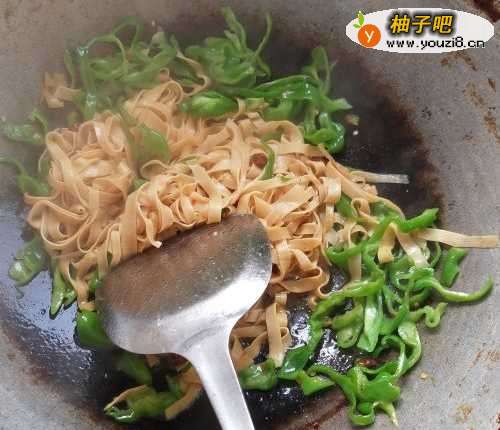 6如图,待豆皮细条和青椒完全熟透后放入适量鸡精,翻炒均匀后关火。