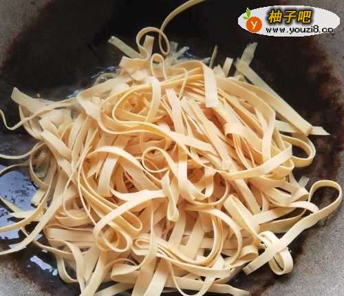 4如图,把切好的豆皮细丝放进锅中并翻炒两下。