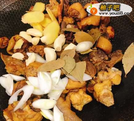 2然后热锅加油,加入鸡块、葱、蒜、香叶等调料翻炒