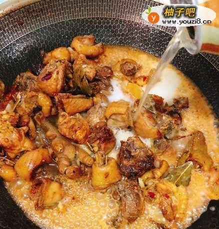 3炒出香味后,加水没过鸡肉,再加入适量酱油、八角、桂皮,中火焖煮25分钟左右