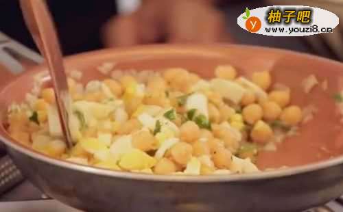 烧一锅开水,先把鹰嘴豆煮熟,然后沥干水分。鸡蛋用水煮熟,一个切碎,另一个切成片。
