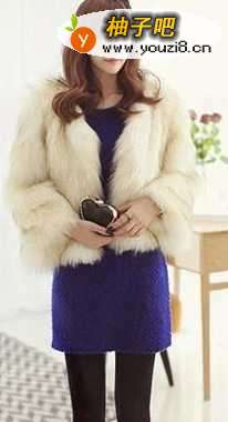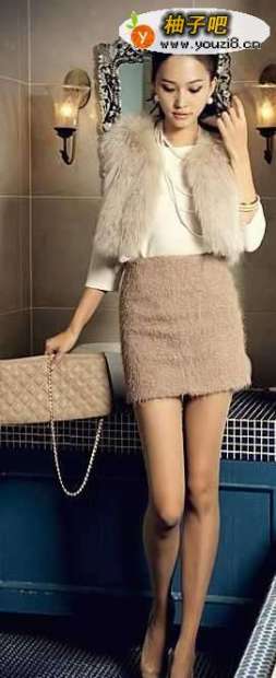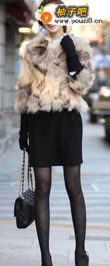 6这款米色皮草,搭配贵族紫短裙,黑色裤袜,显得精灵诱惑。