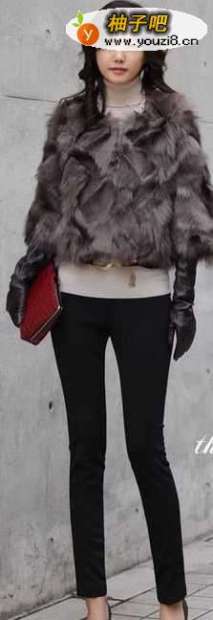 紫灰色皮草搭配黑色休闲紧身裤,脚蹬黑色尖头小皮鞋,显得有气质。