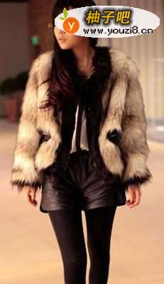 2灰条纹米色皮草搭配黑色打底裤外加黑色小皮短裤,显得年轻俏皮。