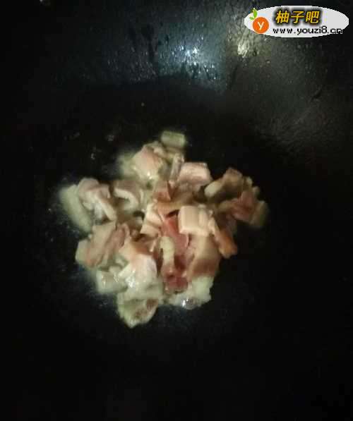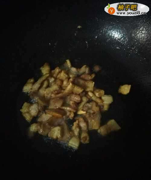 开火,加入适量油,将腊肉下锅,翻炒至腊肉出油;