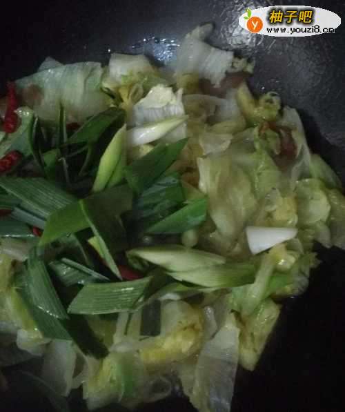 待锅里生菜7-8成熟时,将蒜苗段加入锅里一起翻炒;