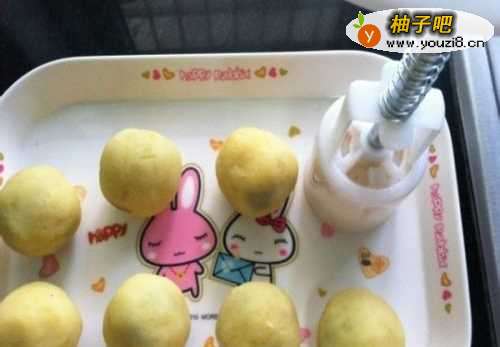 8将绿豆沙搓成长条,分成等量的剂子,然后揉圆,如果喜欢其他口感,也可包入红豆沙等其他东西,然后取来模具,再模具内刷一层油,也可以不刷,然后将揉圆的绿豆沙压进模具里,稍微用些力,压的紧一些,然后按动模具上面的杆,将绿豆糕推出来,这样绿豆糕就做好了。家里没有模具的,也可以用光滑的瓶盖,只不过模具做的更美观一些。