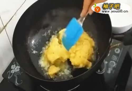7将黄油隔水化开,然后倒入炒锅里,用黄油做香味更浓郁一些,没有黄油也可以用玉米油代替,尽量不要用味道比较重的油,影响口感。再将绿豆沙倒入锅中翻炒,注意要用小火。炒到绿豆沙体积变小,能凝成一块的时候出锅,揉成面团状。