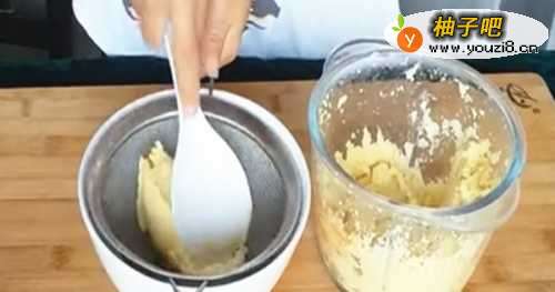 5为了让绿豆沙更细腻,最好过一下筛,将打好的绿豆沙放在打豆浆的那种筛子上,用米饭铲子或者勺子稍微用力向下压,筛下去的绿豆沙更细腻一些。