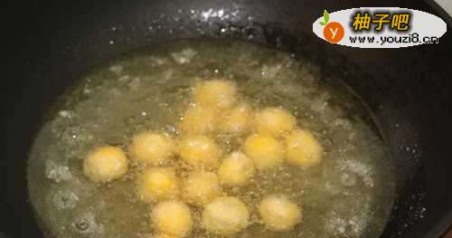 8大火烧热油,油温七成热时,大火烧热油,改小火加入做好的南瓜球,炸至金黄,捞出。