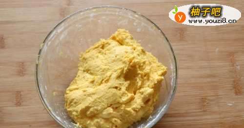 3南瓜泥倒入糯米粉和面粉中,加入蜂蜜,和成光滑的面团。