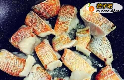3锅中放适量油,放少许盐(可以使鱼皮完整)烧至6成热,放入鱼片煎至断生即可。