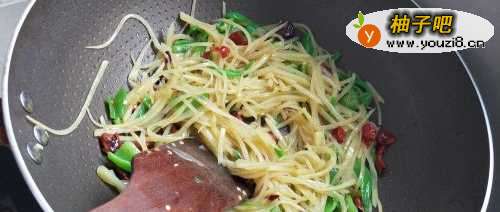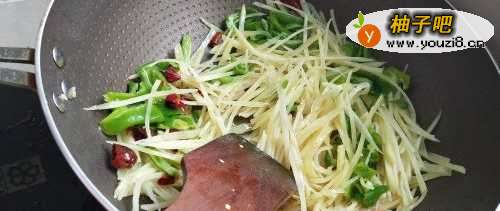 4如图,锅内加入适量色拉油,烧至八成热后放入干红椒爆香,然后放进土豆丝和青椒,翻炒两下。