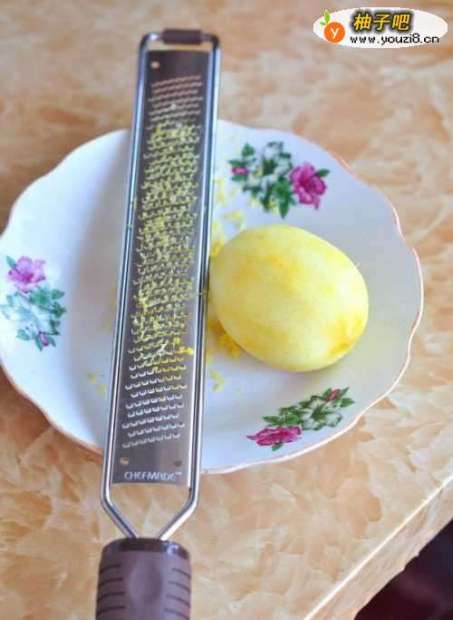 将柠檬洗净晾干,用擦丝器将柠檬表面擦下来。