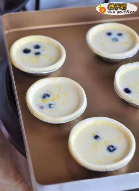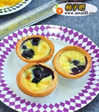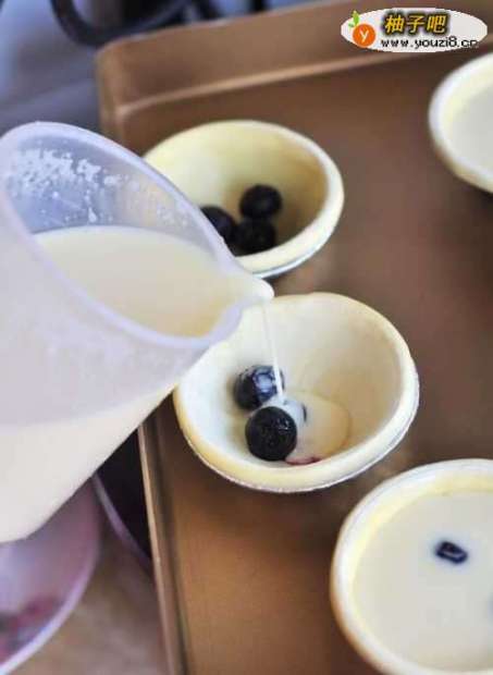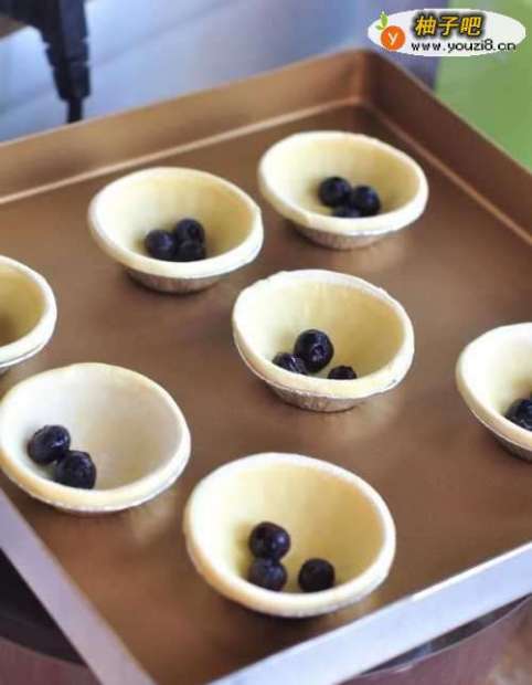 6将蓝莓放入蛋挞皮中,每个挞皮里面放三颗。