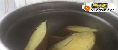 将红薯洗净,中间起开,起锅烧水,水开后放进红薯焖煮大约20分钟,将红薯煮熟。