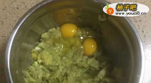 3将搅拌好的红薯泥静置一段时间,等红薯泥放凉以后,加入两个鸡蛋。
