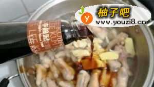 4将去了血水的鸡爪放进煲里。蒜头姜片卤水汁酱油一起放进去煲。。