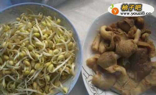 鲍味菇提前泡发,黄豆芽洗净,鸡翅斩段凉水入锅焯水