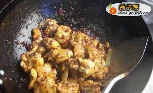3鸡块表面收紧,颜色稍黄时加入烧鸡公调料,翻炒均匀