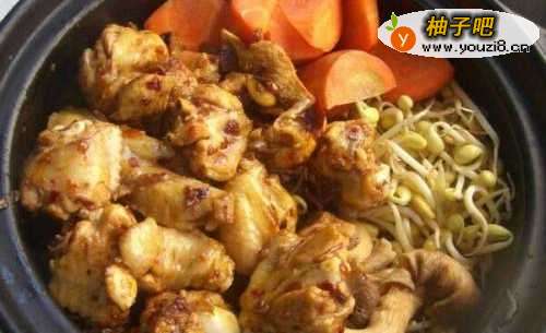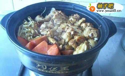 4将豆芽、鲍味菇、胡萝卜、鸡块放入砂锅里