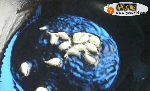 2锅中放少量油炒香蒜头,放入焯好的鸡块煸炒