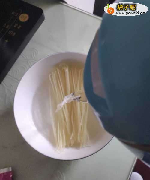 2打开螺蛳粉,将粉丝用热水浸泡至粉丝变软(大约二十分钟);