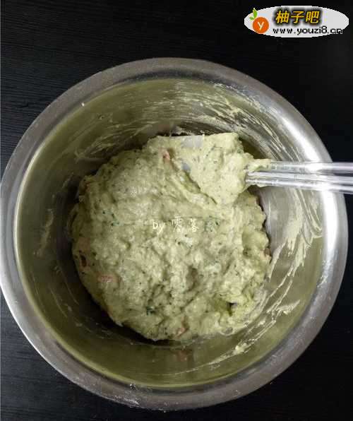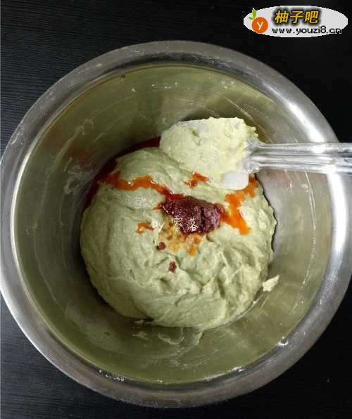 7用刮刀翻拌均匀,无干粉即可停止翻拌,以免面粉起筋;调入适量沙茶酱;