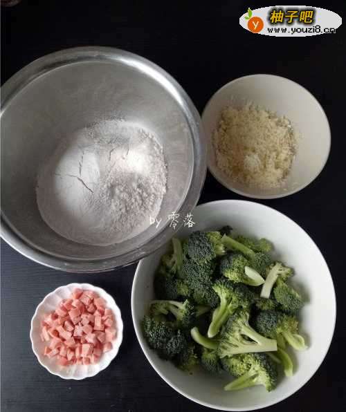备好食材:低筋面粉、无铝泡打粉混合过细筛;西兰花掰成小朵洗净,火腿切丁,马苏里拉芝士刨丝备用。