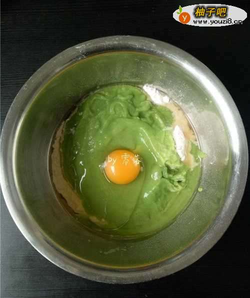 6将西兰花泥倒入面粉盆里,磕入1个鸡蛋,倒入20g玉米油;