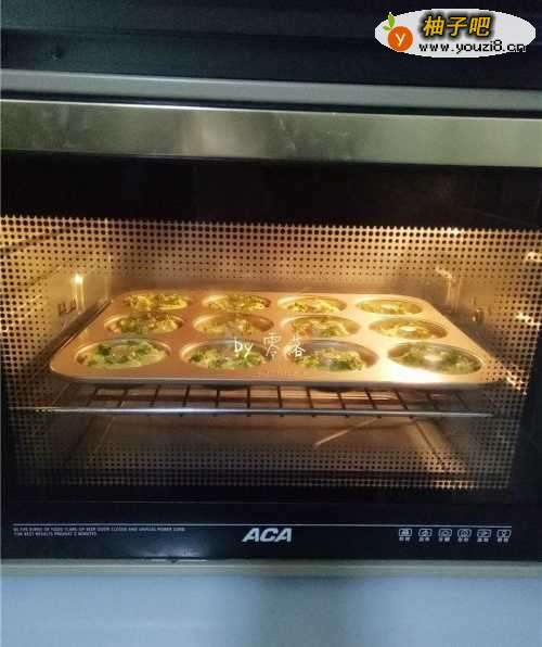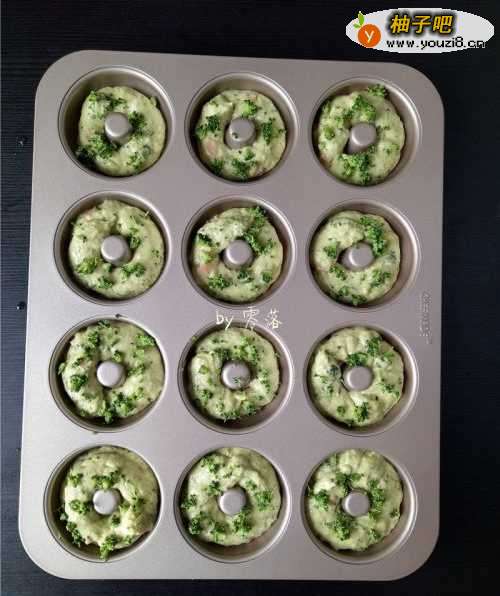 10将面糊倒入模具,撒上西兰花顶部绿色部分;