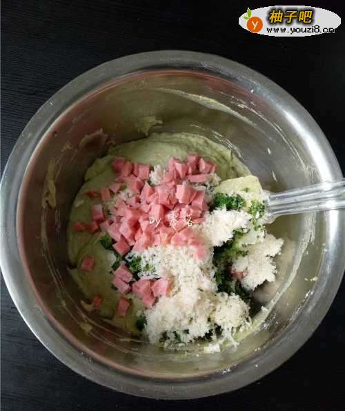 8翻拌均匀,调入火腿丁,马苏里拉芝士,西兰花顶部绿色部分(西兰花可留些做装饰);
