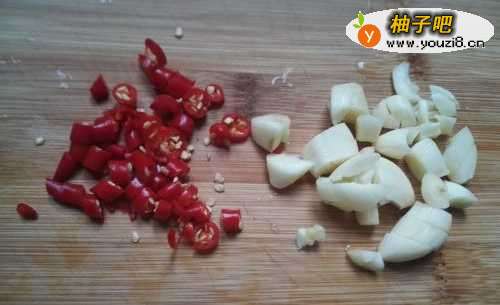 3准备好2个蒜瓣切碎,红尖椒3个洗干净,切成小段备用。