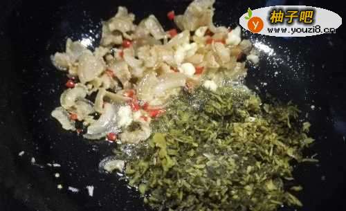 9将辣椒和蒜炒出香味,放入雪菜翻炒几下。